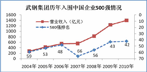 武鋼集團(tuán)在2010中國(guó)企業(yè)500強(qiáng)中排名第42位,在鋼鐵企業(yè)中,營(yíng)業(yè)收入環(huán)比提高42%,營(yíng)業(yè)收入三年平均增長(zhǎng)率為35/。74%。武鋼集團(tuán)首次進(jìn)入世界企業(yè)500強(qiáng)。