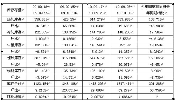 表12009-2010年國慶期間鋼材社會庫存存量變化情況(單位:萬噸)
