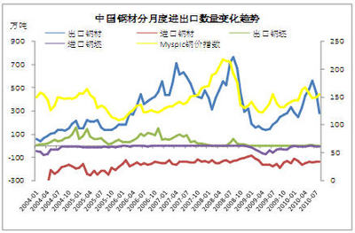 而在此背景下,國內(nèi)供需矛盾略有緩和也使得企業(yè)出口動力不強。7月份我國鋼鐵企業(yè)檢修減產(chǎn)進一步加大,而且檢修限產(chǎn)企業(yè)也從一些小的鋼鐵企業(yè)擴展到唐鋼、武鋼、沙鋼、攀鋼等大中企業(yè)。近幾個月政府新一輪限產(chǎn)限電行動導致國內(nèi)鋼鐵企業(yè)陸續(xù)減產(chǎn)限產(chǎn),我國鋼鐵產(chǎn)量明顯回落,行業(yè)供需矛盾有所改善,企業(yè)在國內(nèi)銷售的壓力相對減小。