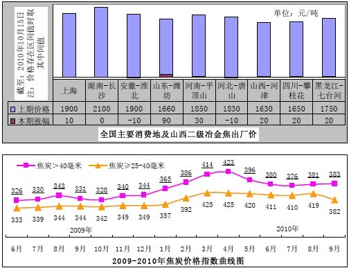 3.焦炭市場(chǎng)波動(dòng)運(yùn)行,價(jià)格由升轉(zhuǎn)降。進(jìn)入9 月份,為實(shí)現(xiàn)節(jié)能減排目標(biāo),各地紛紛采取對(duì)鋼鐵等高耗能行業(yè)限電限產(chǎn)政策,焦炭市場(chǎng)走勢(shì)隨之逆轉(zhuǎn),價(jià)格總體呈回落趨勢(shì)。國(guó)慶節(jié)后,焦炭市場(chǎng)再次呈現(xiàn)小幅回升的走勢(shì)。據(jù)中國(guó)煉焦行業(yè)協(xié)會(huì)數(shù)據(jù),9 月焦炭市場(chǎng)規(guī)格為>40 毫米和≥25-40 毫米的冶金焦每噸均價(jià)分別為1943 元和1884 元,分別比8 月末下降184 元和上漲12 元。據(jù)分析,不同規(guī)格焦炭?jī)r(jià)格走勢(shì)分化的原因主要在于小高爐生產(chǎn)受限,大型高爐有增產(chǎn)可能。據(jù)監(jiān)測(cè)數(shù)據(jù)顯示,截至10 月15 日(與9 月同期比),監(jiān)測(cè)區(qū)域內(nèi)焦炭?jī)r(jià)格漲跌各異,波動(dòng)幅度較為溫和。