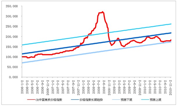 圖2 CR中國焦炭價(jià)格指數(shù)歷史趨勢及預(yù)測范圍