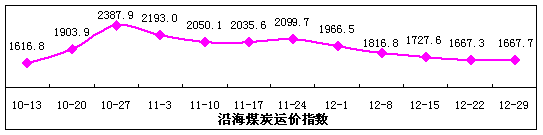 【運(yùn)價(jià)】近期,沿海煤炭運(yùn)輸市場(chǎng)貨源偏少,加之燃油價(jià)格上調(diào),市場(chǎng)運(yùn)價(jià)出現(xiàn)波動(dòng),部分航線運(yùn)價(jià)有所反彈,總體回穩(wěn)。12月29日,秦皇島至廣州和寧波的航線運(yùn)價(jià)分別為57元/噸和49元/噸,比上周分別下降1元/噸和上升1元/噸,而秦皇島至上海的運(yùn)價(jià)為47元/噸,與上周持平。天津、京唐至上海的航線運(yùn)價(jià)48元/噸,比上周下降1元/噸。