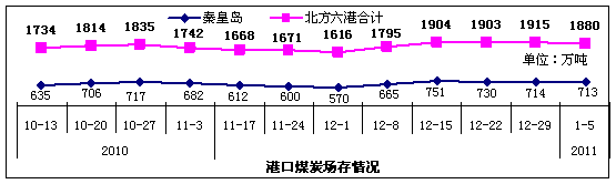 【庫存】截至1月5日,北方六港(不包括黃驊港)煤炭庫存1880萬噸,較上周減少35萬噸,下降 1.8%。數(shù)據(jù)顯示,秦皇島港錨地船舶自2011年1月以來,日均待港船舶降為84艘,其中最低時(shí)僅為67艘,而2010同期日均錨地船舶為178艘,最高時(shí)205艘。同期減少了94艘,降幅達(dá)52.8%。秦皇島港錨地船舶出現(xiàn)了大幅減少。