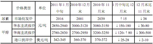 表 1 2010年 12月-2011 年 1 月尿素、甲醇市場(chǎng)價(jià)格情況