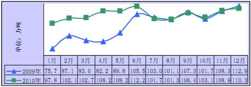 1.焦炭日均產(chǎn)量繼續(xù)上升,月產(chǎn)量同比下降,年產(chǎn)量增幅略降。據(jù)國(guó)家統(tǒng)計(jì)局?jǐn)?shù)據(jù),12 月規(guī)模以上企業(yè)焦炭產(chǎn)量 3420 萬(wàn)噸,同比下降 2.3%,日均產(chǎn)量環(huán)比增長(zhǎng) 1.3%;2010 年全年累計(jì)生產(chǎn)焦炭 3.88億噸,同比增長(zhǎng) 9.1%,增幅比 2009年略降 1.4 個(gè)百分點(diǎn)。
