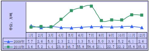 2.焦炭出口量基本穩(wěn)定,出口均價(jià)繼續(xù)回升。據(jù)海關(guān)快報(bào)數(shù)據(jù),12 月出口焦炭 35萬(wàn)噸,同比增長(zhǎng) 4.17 倍,環(huán)比減少 1萬(wàn)噸,2010年全年累計(jì)出口焦炭 335 萬(wàn)噸,同比增長(zhǎng) 5.16倍。
