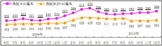 3.焦炭市場(chǎng)總體上行,價(jià)格穩(wěn)步上漲。據(jù)中國(guó)煉焦行業(yè)協(xié)會(huì)數(shù)據(jù),12 月焦炭市場(chǎng)規(guī)格為>40 毫米和≥25 毫米-40 毫米的冶金焦價(jià)格分別為 1947元/噸和 1917元/噸, 分別比 11月末下跌 56元和上漲 48元。據(jù)監(jiān)測(cè)數(shù)據(jù)顯示,截至 2011 年1 月15 日(與上月同期比),監(jiān)測(cè)區(qū)域內(nèi)價(jià)格均有不同程度上漲。