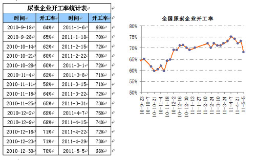 其次,國內(nèi)企業(yè)開工率也被看作是供貨不足從而拉動價格重要因素。誠然,從近兩周國內(nèi)企業(yè)開工情況來看,北方不斷有廠家在安排檢修。如下圖所示,四月底之五月初,全國整體開工率下滑了五個百分點。因此,也有很多商家擔(dān)心開工率過低會引發(fā)供貨緊張,進(jìn)而支撐尿素價格持續(xù)高位。