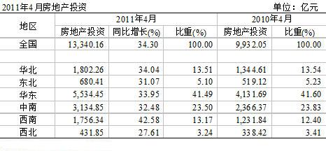 2011年1~4月份,全國累計房地產(chǎn)投資額13,340億元,同比增長34%,房地產(chǎn)投資繼續(xù)保持較快增長。