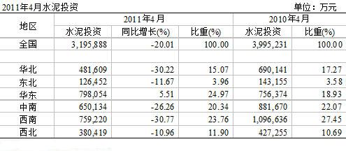 在國家對新建產(chǎn)能的嚴(yán)卡下,水泥投資增長繼續(xù)回落,2011年4月份全國水泥累計投資319億元,同比負(fù)增長20%。