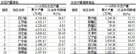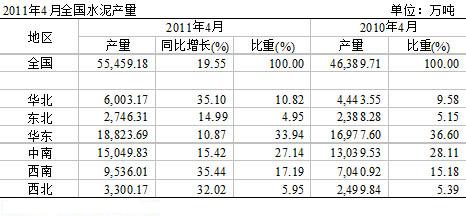 2011年4月份水泥產(chǎn)量5.5億噸,同比增速19.55%。遠(yuǎn)超預(yù)期,從各大區(qū)來看,西南,華北、西北增長均超過30%,其余地區(qū)也超過2位數(shù)增長,說明1~4月份的水泥市場形式依舊保持旺盛。