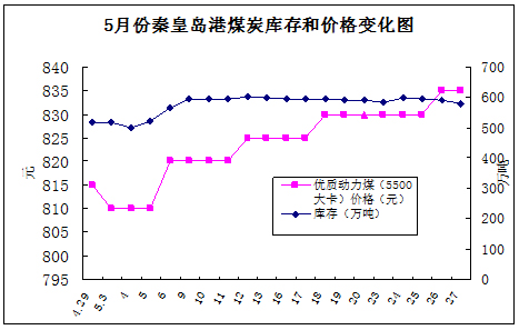 進入5月份以來,秦皇島港煤炭價格繼續(xù)保持高位運行,5月27日,優(yōu)質(zhì)動力煤(發(fā)熱量為5500大卡)價格為835元,較上月底上漲20元,較去年同期上漲70元;煤炭庫存穩(wěn)定保持在較低水平,5月27日,煤炭庫存578.5萬噸,較上月底增加61.4萬噸,較去年同期增加35.1萬噸。
