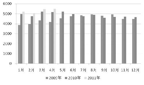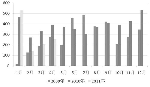 2009—2011年我國(guó)冶金煤月度凈進(jìn)口量