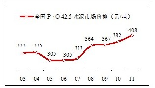 2011年水泥市場(chǎng)仍然延續(xù)高需求、高供給的市場(chǎng)運(yùn)行軌跡,但和往年最大的不同是,價(jià)格曲線有了很大變化,就全國(guó)范圍講, 價(jià)格已脫離了長(zhǎng)期在運(yùn)行在300元/噸的低價(jià)軌道,2008年以后,一是4萬(wàn)億投資拉動(dòng)了市場(chǎng)需求,二是借煤炭?jī)r(jià)格的上漲,在水泥大企業(yè)的帶動(dòng)下較好地轉(zhuǎn)移了上游的上漲成本,水泥價(jià)格開(kāi)始向400元/噸沖擊。可以說(shuō)這是進(jìn)入”十二五”對(duì)水泥產(chǎn)業(yè)的最大利好。水泥產(chǎn)業(yè)擺脫了長(zhǎng)期以來(lái)市場(chǎng)低迷得尷尬境地,上游、下游價(jià)格上漲,水泥價(jià)格原地踏步,甚至走低,使產(chǎn)業(yè)的發(fā)展受到了嚴(yán)重挑戰(zhàn)。在10年水泥工業(yè)高速發(fā)展中成長(zhǎng)起來(lái)的兩位”大佬”海螺郭文叁、中國(guó)建材宋志平攜手進(jìn)入”十二五”,都認(rèn)為未來(lái)10年是水泥發(fā)展的黃金10年。