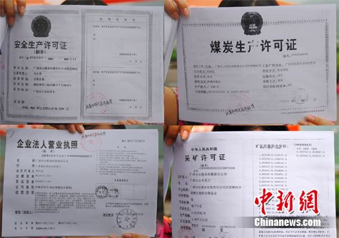 廣西合業(yè)煤業(yè)公司總經(jīng)理蘇福朝向記者出示該公司的營業(yè)執(zhí)照、采礦許可證、安全生產(chǎn)許可證、煤炭生產(chǎn)許可證等相關證照