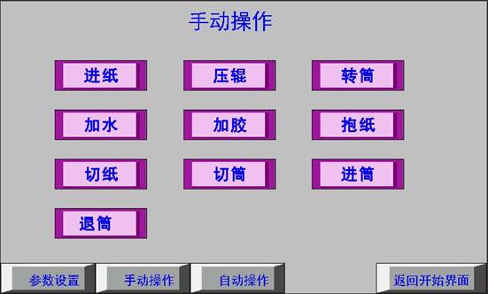 花炮卷筒機(jī)的動(dòng)作主要有:送紙、壓輥、抱紙、卷筒、加水、加膠、切紙、切筒、進(jìn)筒燈一系列工序。根據(jù)工序的特點(diǎn),在PLC的控制程序里有手動(dòng)和自動(dòng)控制兩種控制模式。在手動(dòng)控制模式下,可以單獨(dú)對(duì)每一個(gè)工序的動(dòng)作進(jìn)行控制;當(dāng)切換到自動(dòng)控制模式,PLC程序會(huì)根據(jù)預(yù)先設(shè)置好的流程來控制卷筒機(jī)工作,不需要人工干預(yù)。所有的這些手動(dòng)操作和手/自動(dòng)信號(hào)的切換都是通過觸摸屏進(jìn)行的。