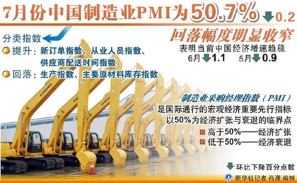 中國物流與采購聯(lián)合會1日發(fā)布數(shù)據(jù)顯示,7月份中國制造業(yè)采購經(jīng)理指數(shù)(PMI)為50.7%,環(huán)比回落0.2個百分點,這是該指數(shù)連續(xù)第四個月出現(xiàn)回落,并創(chuàng)下29個月以來新低。