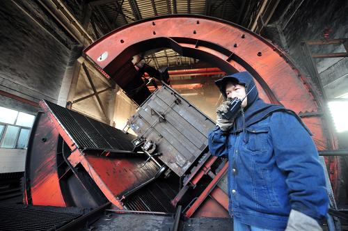 10月11日,在蘭州鐵路局武威南車務段金昌電廠鐵路專用線,一名工作人員在操作轉子卸煤機對運送電煤的車廂進行卸煤作業(yè)。