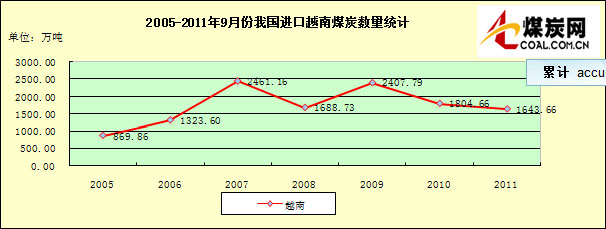 2005-2011年9月份我國(guó)進(jìn)口越南煤炭數(shù)量走勢(shì)統(tǒng)計(jì)