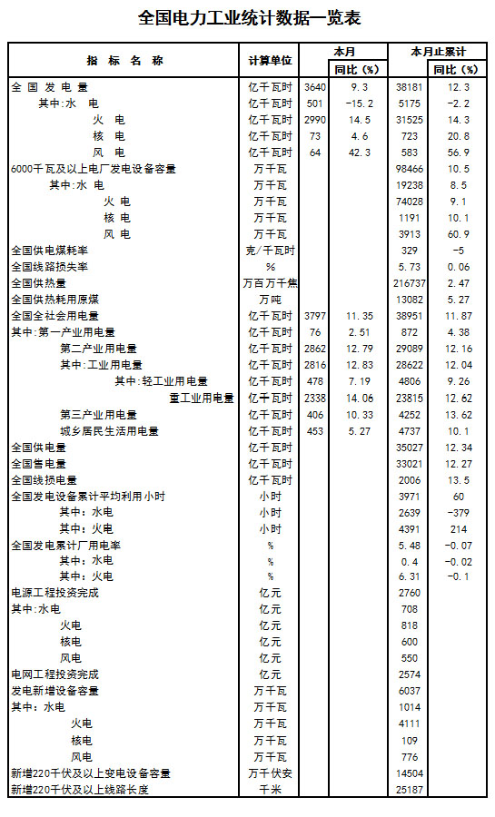 1-10月份,全國(guó)基建新增發(fā)電生產(chǎn)能力(正式投產(chǎn))6037萬千瓦,比上年同期多投產(chǎn)366萬千瓦,主要是第三季度以來新增裝機(jī)容量比上年同期多330萬千瓦左右。1-10月份,水電、火電、核電、并網(wǎng)風(fēng)電分別新增1014萬千瓦、4111萬千瓦、109萬千瓦和776萬千瓦,并網(wǎng)太陽能光伏發(fā)電新增27.7萬千瓦,比上年同期多投產(chǎn)18.7萬千瓦。