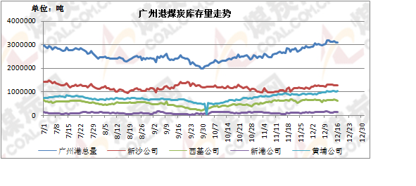 煤炭網(wǎng)信息研究中心截至12月16日的數(shù)據(jù)顯示,本周廣州港煤炭庫存量一直在310萬噸以上的水平居高不下,12月14日更是達(dá)到本周最大庫存量314.5萬噸,直逼廣州港最大場(chǎng)存量,港口煤炭積壓狀況嚴(yán)重,當(dāng)前動(dòng)力煤炭市場(chǎng)集體觀望的形勢(shì)下,港口進(jìn)貨逐步減少,下游需求動(dòng)力不足,出貨更是甚微,港口動(dòng)力煤價(jià)格本周再降。煤炭網(wǎng)信息研究中心截至12月16日的數(shù)據(jù)顯示,本周廣州地區(qū)5000大卡山西優(yōu)混整體較上周下跌50/噸至830元/噸;外貿(mào)煤炭市場(chǎng)方面,4700大卡印尼煤到廣州港價(jià)格本周下降30元/噸至750元/噸,到港南非動(dòng)力煤炭也出現(xiàn)小幅松動(dòng)。