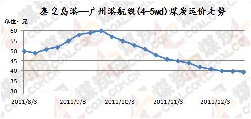 沿海煤炭運輸費用方面,北方各主要煤炭中轉(zhuǎn)港口至廣州港沿海航線煤炭運價本周繼續(xù)走跌,煤炭網(wǎng)信息研究中心12月26日的數(shù)據(jù)顯示,秦皇島港至廣州港(5-6wd)煤炭海運費為36.7元/噸,較上周初下降了1.7元/噸,其它噸位船只至廣州港運價也紛紛跌至年內(nèi)最低。