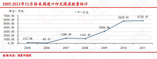 2005-2011年11月份我國(guó)進(jìn)口印尼煤炭數(shù)量走勢(shì)統(tǒng)計(jì)