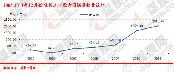 2005-2011年12月份我國進口蒙古國煤炭數(shù)量走勢統(tǒng)計