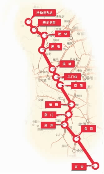 根據(jù)建設(shè)方案,新建蒙西至華中地區(qū)鐵路煤運通道工程線路北起東烏鐵路浩勒報吉站,途經(jīng)內(nèi)蒙古自治區(qū)鄂爾多斯地區(qū)、陜西省榆林、延安地區(qū)、山西省運城地區(qū)、河南省三門峽、南陽地區(qū)、湖北省襄陽、荊門、荊州地區(qū)、湖南省岳陽地區(qū),終點到達江西省吉安,線路全長1837公里。