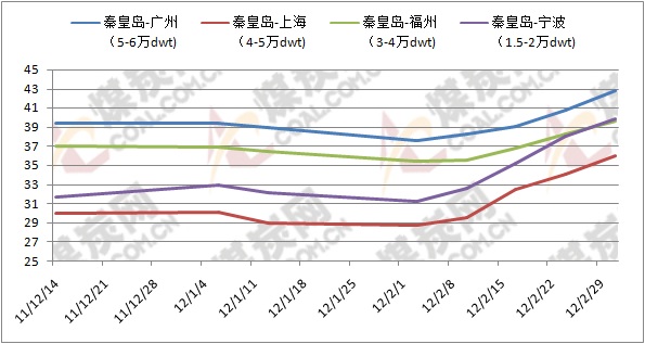 附圖:2月份我國沿海地區(qū)煤炭運價走勢情況 單位:元/噸