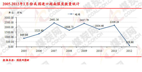 2005-2012年1月份我國進口越南煤炭數量走勢統(tǒng)計