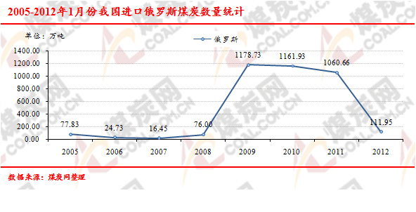 2005-2012年1月份我國(guó)進(jìn)口俄羅斯煤炭數(shù)量走勢(shì)統(tǒng)計(jì)