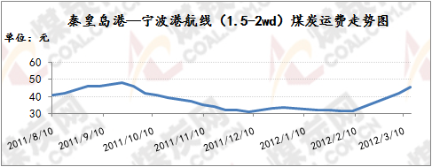 沿海煤炭運(yùn)輸方面,本周沿海煤炭航運(yùn)市場繼續(xù)走好,沿海煤炭運(yùn)價(jià)連續(xù)五周保持上漲,沿海動(dòng)力煤市場下行趨勢結(jié)束,煤價(jià)觸底、局部上揚(yáng),下游電廠抓住此時(shí)機(jī)加大了采購力度,推動(dòng)了沿海運(yùn)價(jià)繼續(xù)走高。本周截至3月12截至3月16日,秦皇島港至寧波港(1.5-2wd)、上海港(4-5wd)航線煤炭運(yùn)價(jià)分別上漲2元、2.2元至45.9元/噸、42.1元/噸。