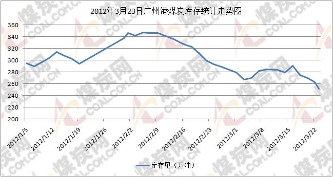 港口庫存方面:煤炭網信息研究中心近期數據顯示,本周廣州港庫存總量維持在260-270萬噸,近期庫存處于相對合理水平,商家煤炭走量速度有所加快。截止到3月23日,港口煤炭庫存達到251.02萬噸,比上周同期減少39.13萬噸,跌幅達15%。其中新沙公司庫存122萬噸,較上周同期減少20萬噸;西基公司存煤55萬噸,較上周同期增加2萬噸;新港公司存煤64.97萬噸,較上周同期增加49.77萬噸;黃埔公司存煤9.04萬噸,較上周同期增加1.05萬噸。