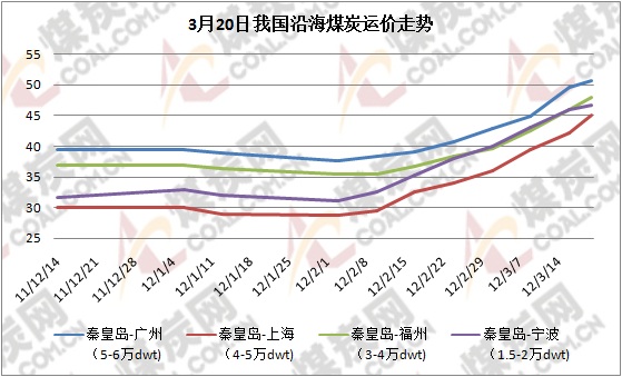沿海運費:煤炭網信息研究中心數據顯示:隨著國內煤炭需求的逐漸回升,廣州等消費地區(qū)儲煤意識加強,帶動華南地區(qū)煤炭運輸航線運價繼續(xù)上漲。截止到3月20日,秦皇島港-廣州(5-6萬dwt)運價50.6元/噸,比上期回升1元/噸;秦皇島-福州(3-4萬dwt)運價47.9元/噸,比上期回升1.9元/噸。本周沿海煤炭運輸價格保持穩(wěn)步上漲,大秦線檢修在即,下游耗煤企業(yè)積極囤煤,北方港口錨地船和經辦手續(xù)的船只較前期大幅增加。其次燃料油價格的上漲致使船舶運輸成本的提升。