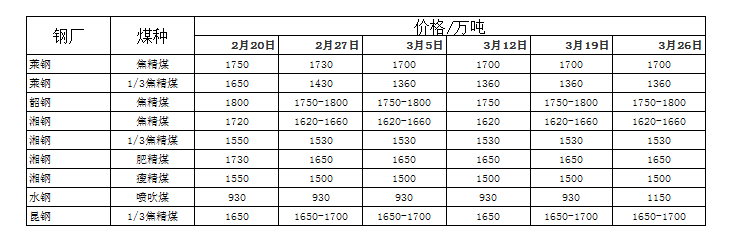 上游方面:三月份國內(nèi)煉焦煤弱勢盤整,多以維穩(wěn)為主,山西柳林焦煤G85V21S0.5A9車板含稅1620元/噸,鄉(xiāng)寧焦煤G60-70V16-20S0.5A10車板含稅1600元/噸,靈石肥煤G90S30-36S0.6A15-17坑口含稅990元/噸;河北唐山焦煤G80V23-25S1A10Y20出廠含稅1600元/噸;黑龍江七臺河肥煤G100V30S0.3A10Y27車板含稅1630元/噸;山東棗莊1/3焦煤G72V38S0.8A8車板含稅1380元/噸;烏海1/3焦煤G83V30S1.1A11Y20出廠含稅1050元/噸;六盤水焦煤G79V25.3S0.6A10Y20出廠含稅1580元/噸。下個(gè)下降空間有限,波動(dòng)空間逐漸縮小。