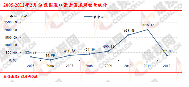 2005-2012年2月份我國(guó)進(jìn)口蒙古國(guó)煤炭數(shù)量走勢(shì)統(tǒng)計(jì)