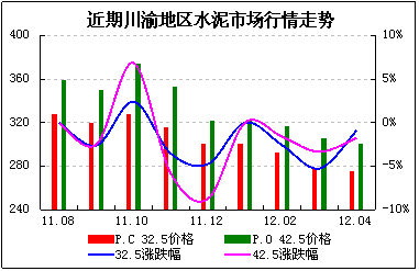與整個西南市場相比,川渝市場的走勢說不上好,但也不算太差。雖然近期一直處于下跌通道,但本月跌幅略有縮小,市場信心開始逐步恢復(fù)。本月川渝市場均價P.O42.5標(biāo)號水泥(下同)為300.7元/噸,相比上月的306.1元/噸,跌幅為1.8%,而上月跌幅為3.3% 。