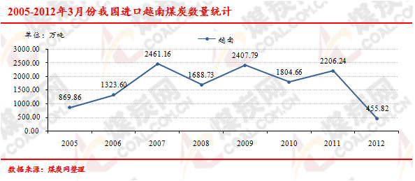 2005-2012年3月份我國進口越南煤炭數(shù)量走勢統(tǒng)計