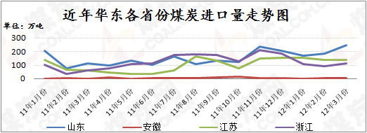 【動(dòng)力煤市場】本周華東動(dòng)力煤市場總體表現(xiàn)弱勢(shì)平穩(wěn),市場供需處在寬松狀態(tài),下游電廠庫存高位的事實(shí)難以改變,電廠的日耗煤近期并未明顯提升,對(duì)煤炭的采購積極性仍舊處在低位,各省份目前雖已下達(dá)電煤保障任務(wù),如山東省政府下達(dá)“30天電煤庫存令”, 安徽下達(dá)“6-9月全省電煤保供2251萬噸”任務(wù),但目前下游電廠的高位庫存達(dá)到任務(wù)目標(biāo)幾乎沒有難度,華東煤炭市場、港口的煤炭甚至有人用“鋪天蓋地”來形容,山東部分電廠的煤炭庫存量已經(jīng)處在30天的水平,魯中、魯北最近一期的電煤接收價(jià)格主流下降,因此,在“買方市場”背景下,電廠的采購“不慌不忙”,在煤企正常生產(chǎn)、市場供大于求的狀況下,華東動(dòng)力煤市場難以獲得明顯的利好支撐。另外,在全球動(dòng)力煤價(jià)格持續(xù)大幅度下挫的背景下,進(jìn)口動(dòng)力煤大量進(jìn)入中國市場更具有優(yōu)勢(shì),華東地區(qū)今年一季度的煤炭進(jìn)口量呈現(xiàn)逐月上升的趨勢(shì),而且同期比上升明顯(下圖),進(jìn)口煤對(duì)促成華東動(dòng)力煤市場的“供大于求”失衡態(tài)勢(shì)又起到了推動(dòng),對(duì)當(dāng)?shù)孛簝r(jià)也有一定的沖擊。就國內(nèi)能夠影響到華東煤炭市場的大環(huán)境來看,上游主產(chǎn)地動(dòng)力煤弱勢(shì)持穩(wěn),北方主要煤炭中轉(zhuǎn)港本周除5500大卡平倉價(jià)持穩(wěn)未動(dòng)外,其它如Q4500、Q5000、Q5800的動(dòng)力煤價(jià)格均有5-10元/噸的下調(diào),反映了整個(gè)國內(nèi)動(dòng)力煤市場需求的不足,對(duì)消費(fèi)地—華東地區(qū)動(dòng)力煤市場的支撐微弱。