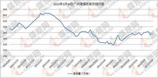 港口庫存方面:煤炭網(wǎng)信息研究中心近期數(shù)據(jù)顯示,廣州港煤炭庫存較上周有所回落,但是依舊維持在270萬噸左右水平。截止到5月11日,廣州港煤炭庫存量為271.36萬噸嗎,較前上周同期減少8.26萬噸。其中新沙公司庫存142萬噸,較上周同期減少7萬噸;西基公司存煤59萬噸,較上周同期減少4.2萬噸;新港公司存煤57.15萬噸,較上周同期增加5.7萬噸;黃埔公司存煤13.21萬噸,較上周同期減少2.76萬噸。