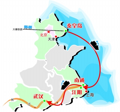 所謂電煤“海進(jìn)江”,是指煤炭從大秦鐵路(601006,股吧)線(大同至秦皇島)運(yùn)抵秦皇島港后,經(jīng)海運(yùn)到江蘇江陰或者南通等港口換船,再逆長(zhǎng)江而上,轉(zhuǎn)運(yùn)至沿江各港口,再輾轉(zhuǎn)運(yùn)到華中等地的各大火電廠?缭酱蟀雮(gè)中國(guó)。