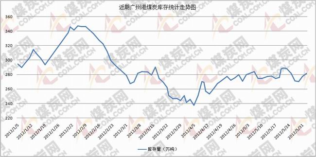港口庫存方面:煤炭網(wǎng)信息研究中心數(shù)據(jù)顯示,截止到6月3日,廣州港存煤278.6萬噸,叫上周同期增加7.39萬噸。其中新沙公司庫存149萬噸,較上周同期增加4萬噸;西基公司存煤57萬噸,較上周同期減少1萬噸;新港公司存煤53.42萬噸,較上周同期增加6.41萬噸。黃埔公司存煤19.17萬噸,較上周同期減少2.02萬噸。