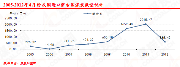 2005-2012年4月份我國進口蒙古國煤炭數(shù)量走勢統(tǒng)計