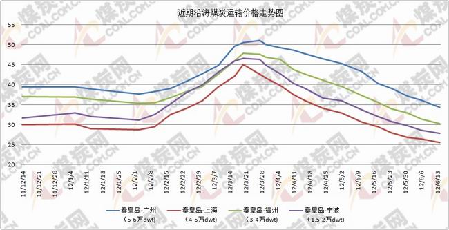 沿海運費:本周沿海煤炭運費繼續(xù)探底,船運公司毫無攬貨的積極性,沿海煤炭運輸市場陷入“有價無市”的境地。由于國內(nèi)需求繼續(xù)放緩,沿海港口、電廠存煤居高不下,使得煤炭運費繼續(xù)低迷。截止到6月14日,秦皇島-廣州(5-6萬DWT)運價34.4萬噸,較5日下跌1.9元;秦皇島-福州(3-4萬DWT)運價30.2元/噸,較上期下跌1.7元;天津-上海(2-3萬DWT)運價26.8元/噸,較上期下跌0.9元;天津-鎮(zhèn)江(1-1.5萬DWT)運價33 元/噸,較上期下跌1.3元;秦皇島-寧波(1.5-2-6萬DWT)運價27.8元/噸,較上期下跌1.1元。目前,船運公司普遍出現(xiàn)虧損運營,大多依靠過去積累的利益來維持,而沿海煤炭云價低迷,嚴(yán)重打擊了船運公司運煤的積極性,沿海航運市場已經(jīng)形成了有價無市的局面,船舶公司寧可將大量船舶拋錨停航,否則航運市場可能更加慘淡。截至6月13日,環(huán)渤海煤炭發(fā)運港口錨地的船舶數(shù)量持續(xù)下降,其中,秦皇島港錨地船舶數(shù)量為83艘,曹妃甸港的船舶數(shù)量僅為2艘,其他港口錨地船舶數(shù)量也處低位,港口出現(xiàn)罕見的空泊現(xiàn)象。