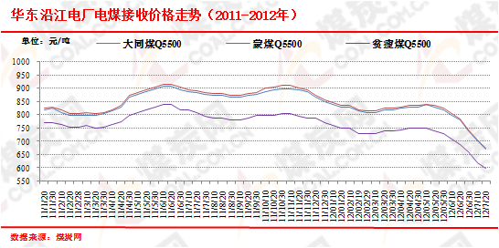 華東沿海電廠方面,2012年7月中旬,華東沿海電廠電煤接收價(jià)格整體再降20-30元/噸,其中,上海石洞口二廠、江蘇南通華能、江蘇太倉華能大同煤Q5800、Q5500、Q5000的接收價(jià)格均降30元/噸,夏港電廠、揚(yáng)州二電蒙煤Q5500、Q5000接收價(jià)格也下降30元/噸,石洞口一廠、南通天生港電廠貧瘦煤接收價(jià)下降20元/噸。此次已是華東沿江電廠自5月中旬開始連續(xù)7旬下降,但此次跌幅較上旬下跌幅度已經(jīng)有所收窄。
