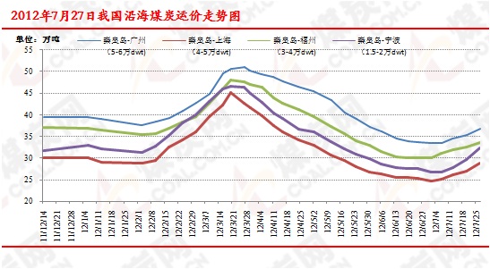 沿海運(yùn)費(fèi):本周國內(nèi)沿海煤炭運(yùn)費(fèi)小幅回升,其中短途運(yùn)費(fèi)回升較快。截止到7月27日,秦皇島-廣州(5-6萬DWT)運(yùn)價(jià)36.8元/噸,周環(huán)比回升1.5元;秦皇島-福州(3-4萬DWT)運(yùn)價(jià)33.6元/噸,周環(huán)比回升1.2元;天津-上海(2-3萬DWT)運(yùn)價(jià)30.4元/噸,周環(huán)比回升2.1元;天津-鎮(zhèn)江(1-1.5萬DWT)運(yùn)價(jià)37.7元/噸,周環(huán)比回升2.6元;秦皇島-寧波(1.5-2-6萬DWT)運(yùn)價(jià)32.3元/噸,周環(huán)比回升2.6元。近期重點(diǎn)發(fā)電集團(tuán)電煤庫存較6月份的庫存高點(diǎn)回落180萬噸左右,隨著迎峰度夏的展開,下游耗煤企業(yè)再次派船拉煤的積極性有所提高,沿海航運(yùn)市場(chǎng)船舶運(yùn)力需求有所增加。目前在港口錨地船舶數(shù)量較前期有所增多。