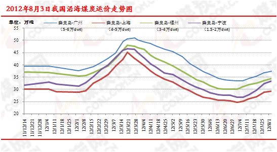 沿海運(yùn)費(fèi):本周國內(nèi)沿海煤炭運(yùn)費(fèi)小幅回升,其中短途運(yùn)費(fèi)回升較快。截止到8月3日,秦皇島-廣州(5-6萬DWT)運(yùn)價37.3元/噸,周環(huán)比回升0.5元;秦皇島-福州(3-4萬DWT)運(yùn)價34.3元/噸,周環(huán)比回升0.7元;天津-上海(2-3萬DWT)運(yùn)價31.2元/噸,周環(huán)比回升0.8元;天津-鎮(zhèn)江(1-1.5萬DWT)運(yùn)價38.9元/噸,周環(huán)比回升1.2元;秦皇島-寧波(1.5-2-6萬DWT)運(yùn)價33.4元/噸,周環(huán)比回升1.1元。本周我國沿海煤炭運(yùn)輸市場上漲勢頭有所放緩,受雙臺風(fēng)“蘇拉”、“達(dá)維”登陸的影響,北方港口以及黃河中下游地區(qū)10多個省份行成強(qiáng)降雨、大風(fēng)天氣,其中海上北煤南運(yùn)航線中斷運(yùn)輸,沿海船舶紛紛靠港避風(fēng),港口煤炭調(diào)入量和調(diào)出量均有所減少,沿海運(yùn)費(fèi)雖有上漲但是上漲幅度已經(jīng)大幅回調(diào)。未來幾天沿海地區(qū)還將有大風(fēng),屆時港口運(yùn)輸還將受到影響。