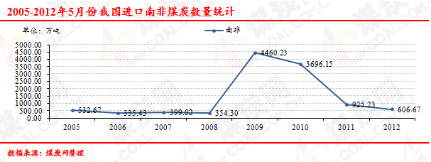 2005-2012年5月份我國進口南非煤炭數(shù)量走勢統(tǒng)計