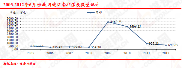 2005-2012年6月份我國進口南非煤炭數(shù)量走勢統(tǒng)計